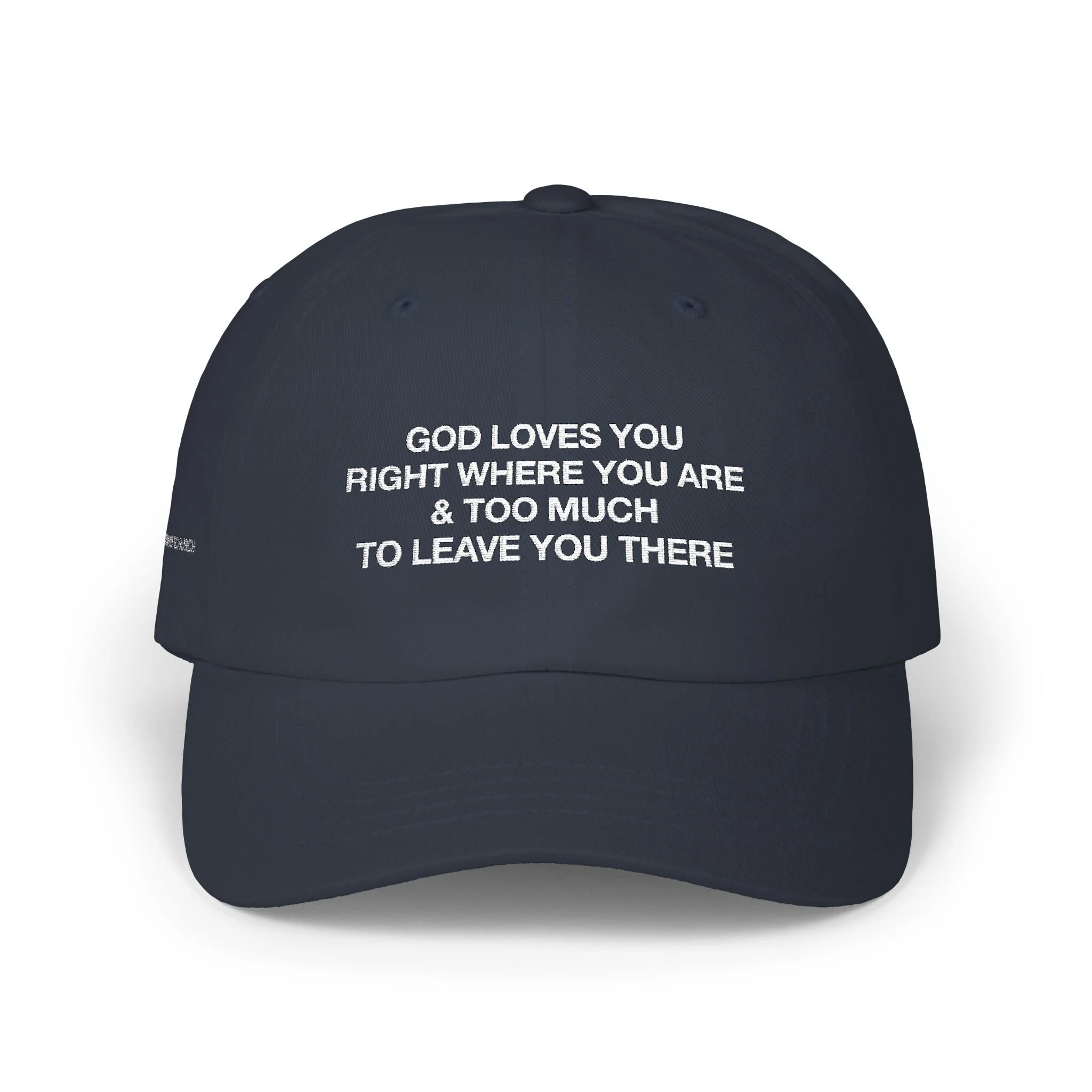 Simple, quiet, and quietly confident — this classic dad cap speaks with a gentle, steady voice. Embroidered on the front is a short, thoughtful message that lands like a warm reminder: present, compassionate, and a little wry. The low-profile, unstructured crown and pre-curved visor keep the silhouette relaxed, while the antique-brass hideaway strap lets you dial in a comfortable fit. Wear it while running errands, sitting through a slow Sunday service, or meeting friends for coffee; it settles into the background and keeps attention on what matters — your presence and the people around you.